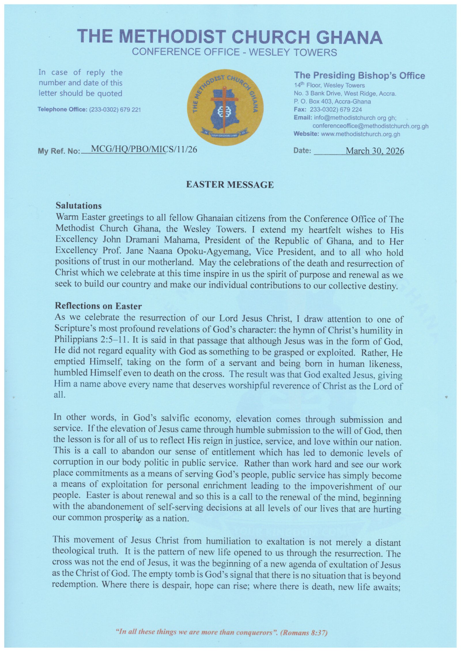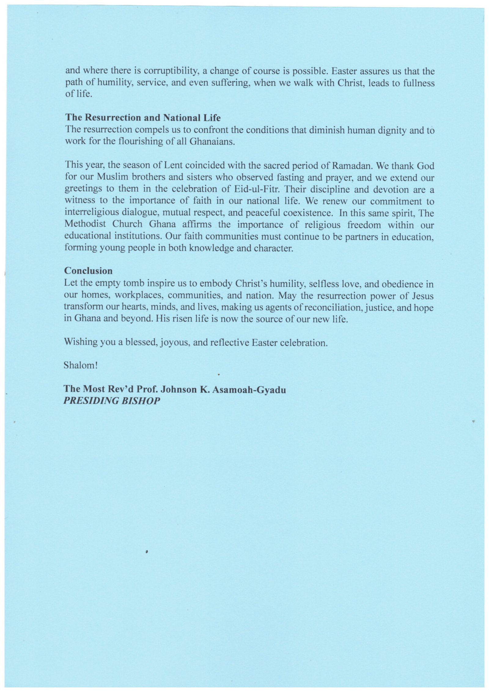 The Presiding Bishop encouraged all Ghanaians to apply the principles of humility, selfless service, and moral integrity in their homes, workplaces, and communities. He concluded the message by wishing all citizens a blessed, joyous, and reflective Easter celebration.