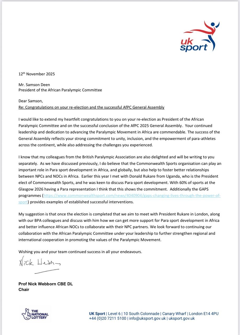 Prof. Webborn reaffirmed UK Sport’s readiness to deepen its engagement with the continent, stating: “We look forward to continuing our collaboration with the African Paralympic Committee under your leadership.” The message, described by observers as both congratulatory and forward-looking, is seen as a strong endorsement of President Deen’s role in Africa’s rapidly growing Paralympic movement.